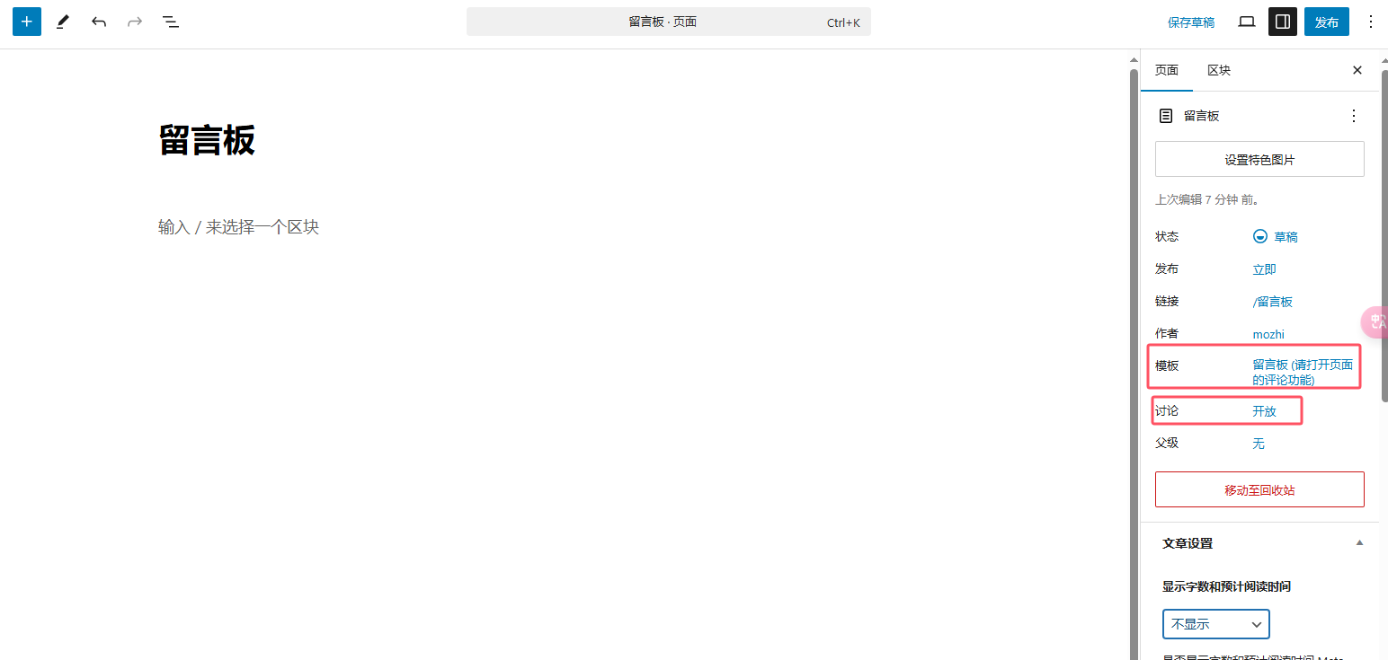 我们还是新建一个页面,标题叫留言板,注意这里什么内容都不要写,模板选择留言板,把允许评论打开