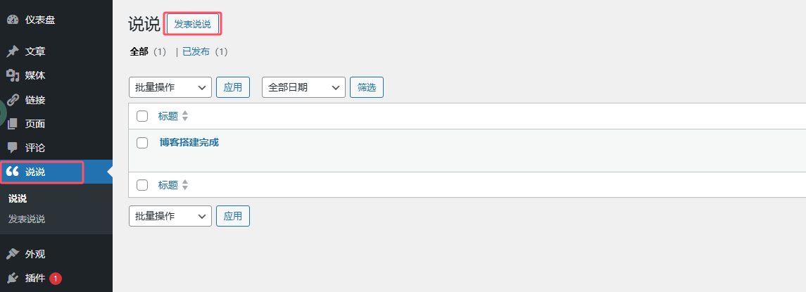 首先我们要新建一个页面,标题就写说说。在左侧栏(如果没有就点一下上面框出来的按钮)把模板改成说说,然后你可以选择让不让别人评论你的说说。设置完后点击发布即可。