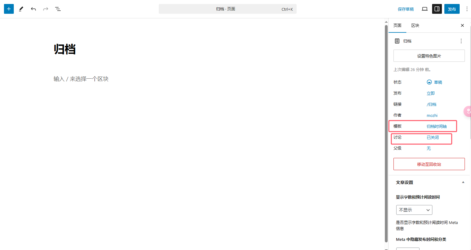 新建一个页面,标题为归档(你也可以取一些其他的名字),里面的内容建议不用写,你要写的话也是没问题的,然后模板选择归档时间轴,个人建议关掉讨论。