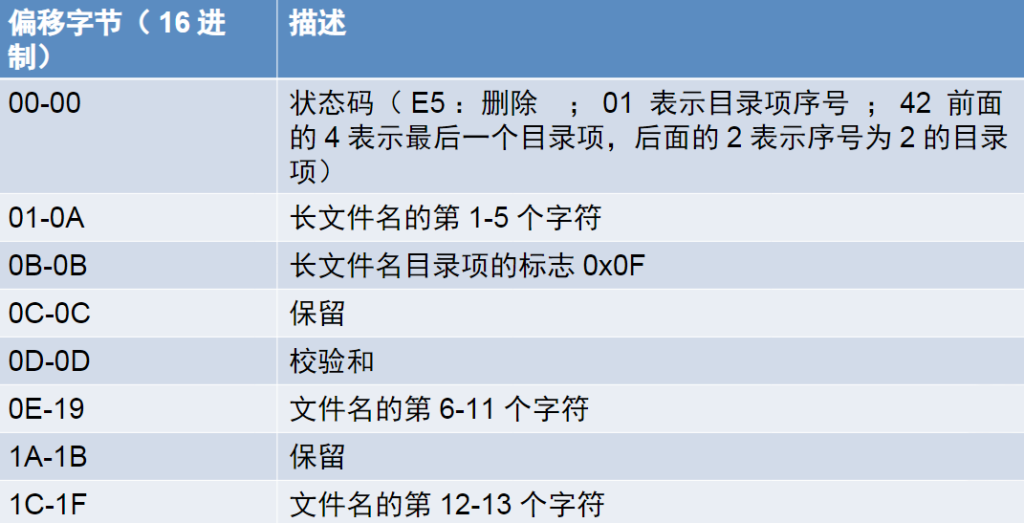 当文件名超过 8 个字节时,就需要用长文件名目录项来存储文件名。长文件名目录项的 0x0B 位置的标志一定是 0x0F,目录项是用 Unicode 编码存储文件名的。